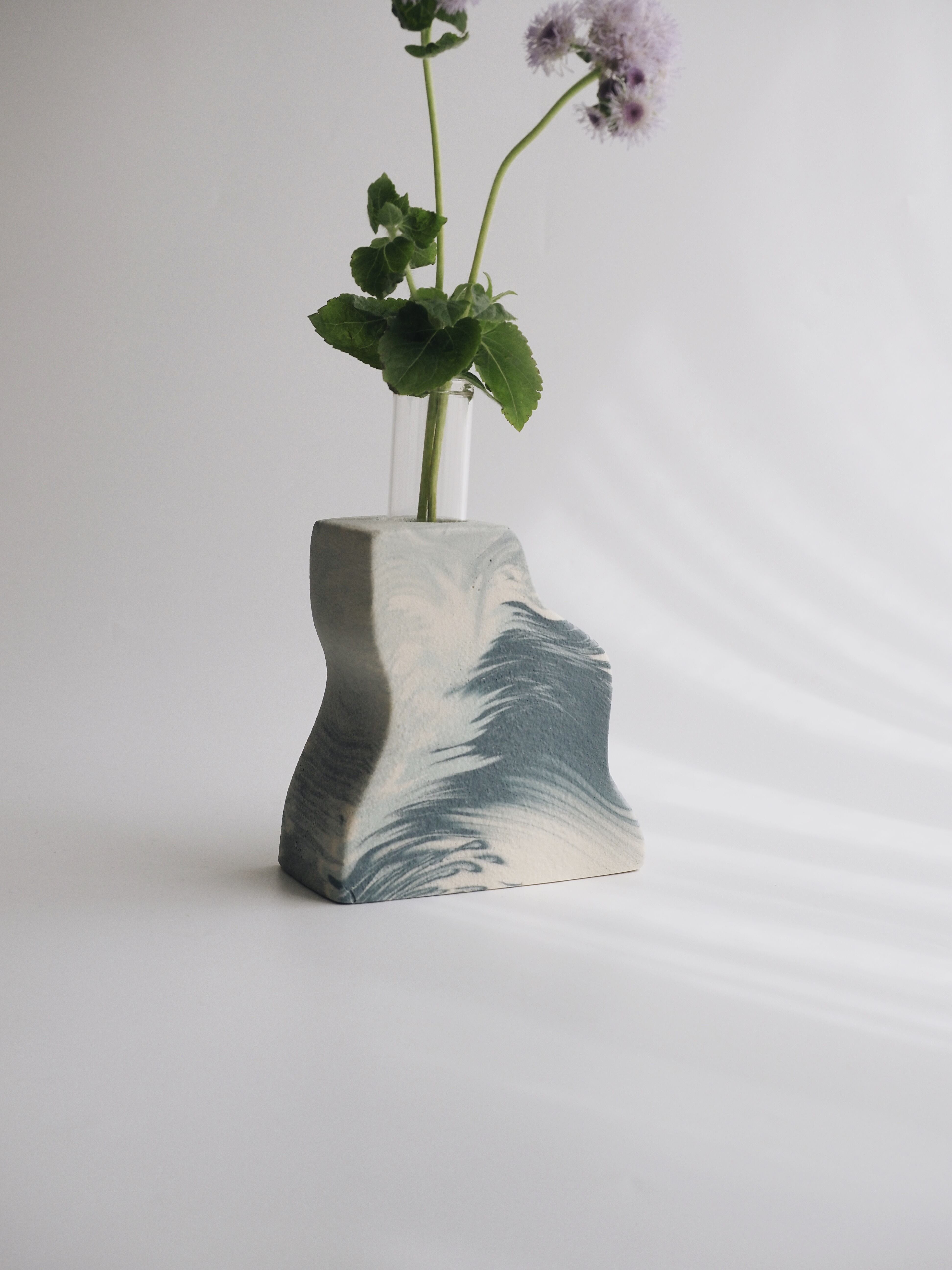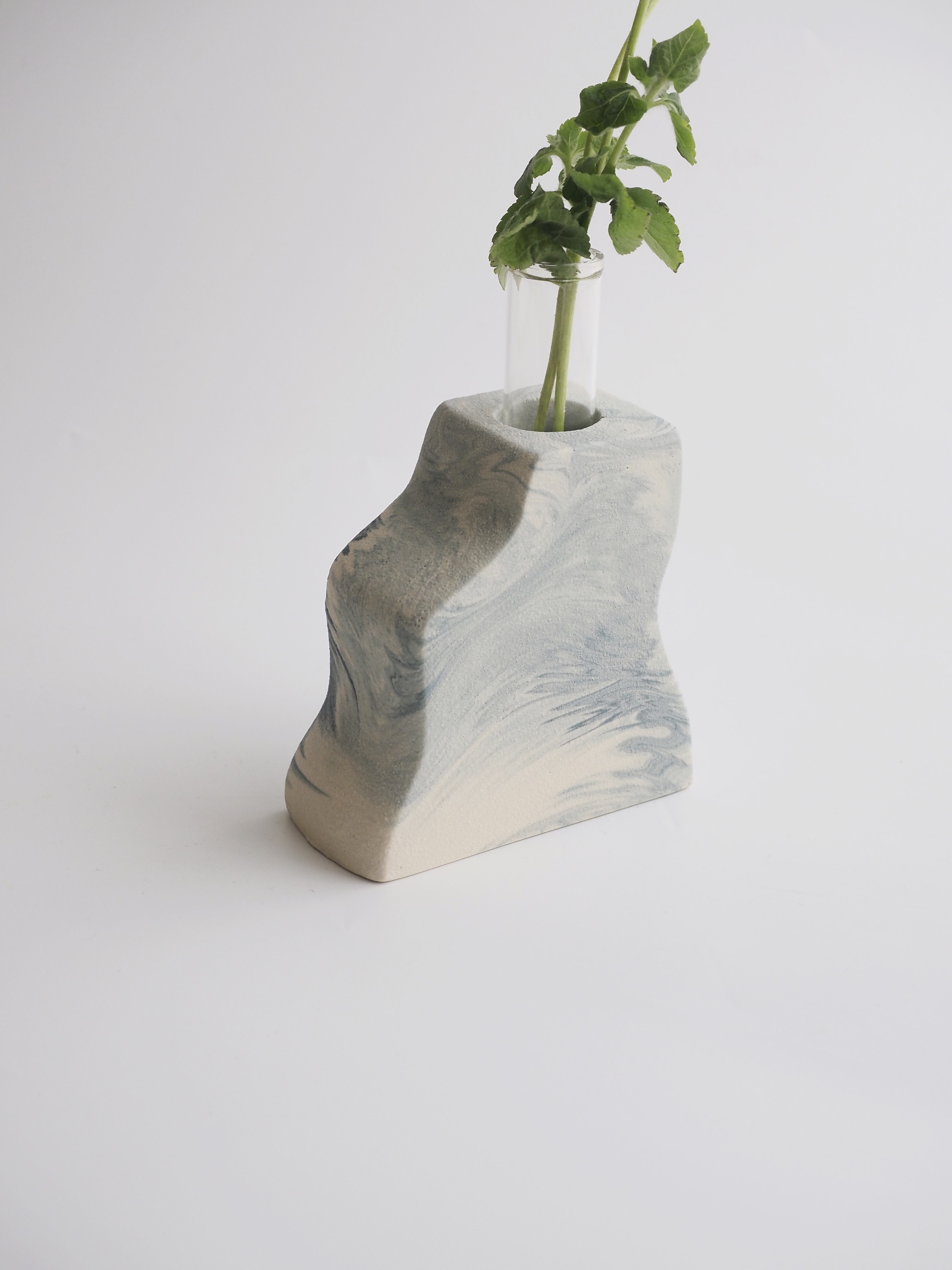 歪みや皺、気泡を残し石をそのまま削り出したような手触りの、ずっしりとした一輪挿しです。